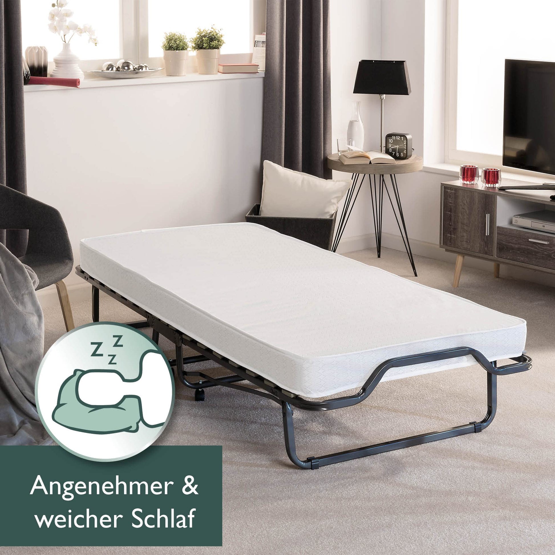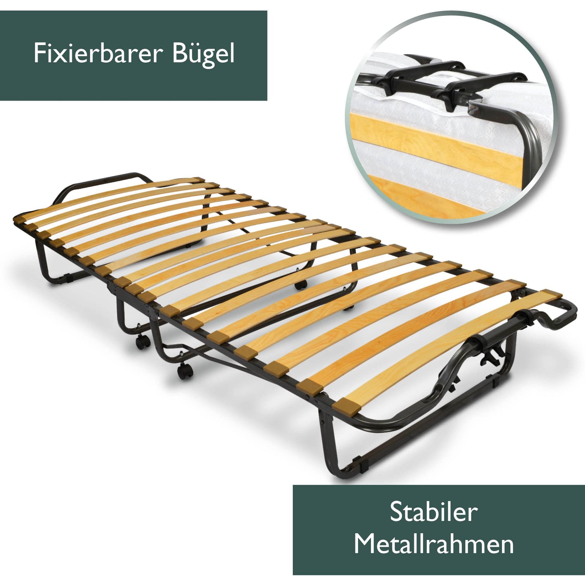 - 𝗦𝗧𝗔𝗕𝗜𝗟𝗘𝗥 𝗦𝗧𝗔𝗛𝗟𝗥𝗔𝗛𝗠𝗘𝗡 - Mit dem stabilen Metallrahmen kann das bequeme Gästebett ein Gewicht von bis zu 100 kg tragen. Außerdem ist der Rahmen für mehr Komfort und Stabilität mit Holzlatten verstärkt. Das faltbare Notbett wiegt ca. 25 kg und hat zusammengeklappt eine Größe von 90 x 35 x 113 cm.